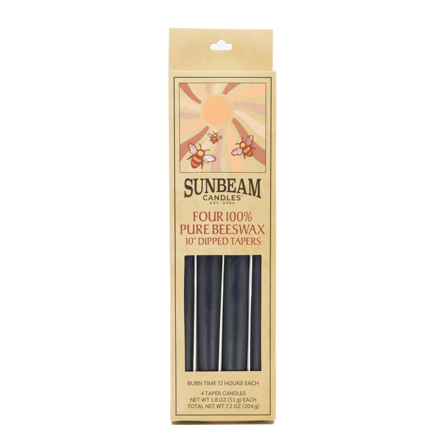Packed two pairs per box, our Beeswax Dipped 10" Tapers are crafted with a classic drip-style bottom finish, making them suitable for candle holders in many sizes. Created using 100% pure beeswax, eco-friendly dyes, and a cotton wick.