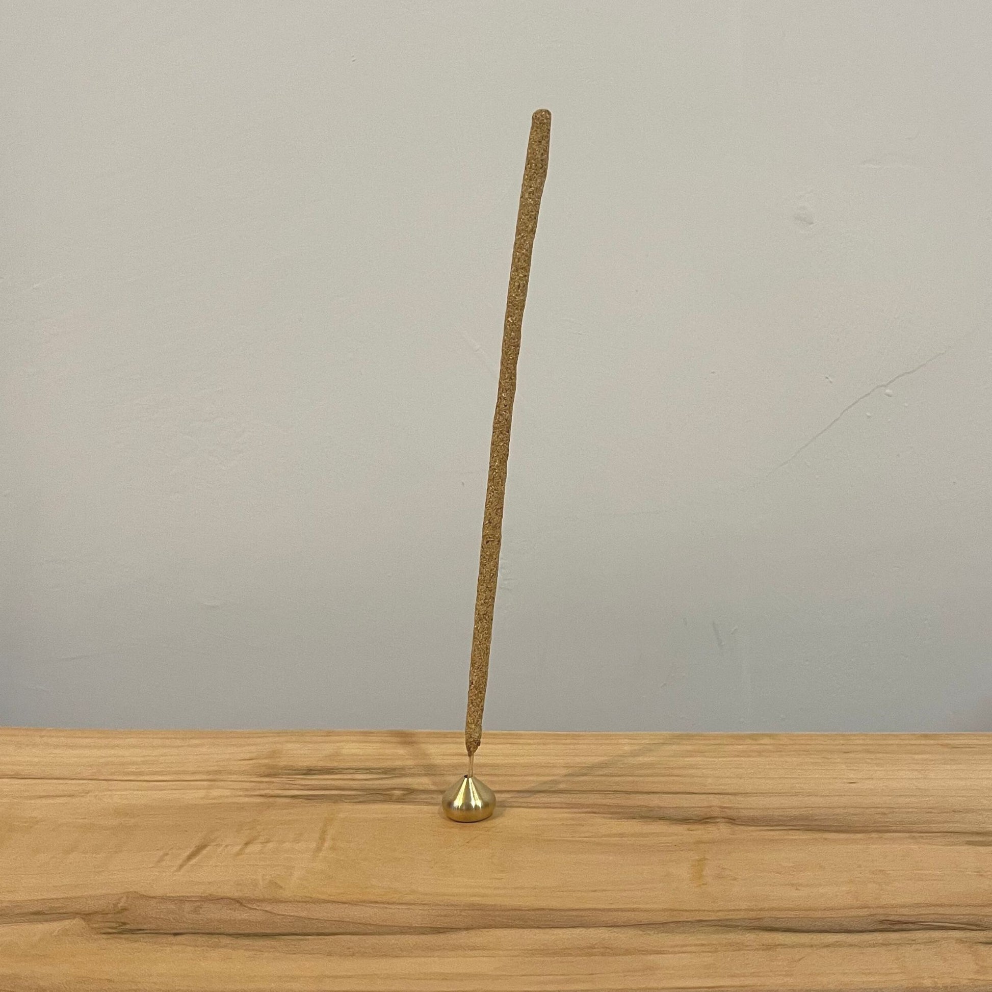 A minimalist water drop shape incense holder made of brass. The holder is versatile, it can be used by itself, inside a bowl, or on top of a plate. The brass has a nice weight that holds the incense safely upright.
