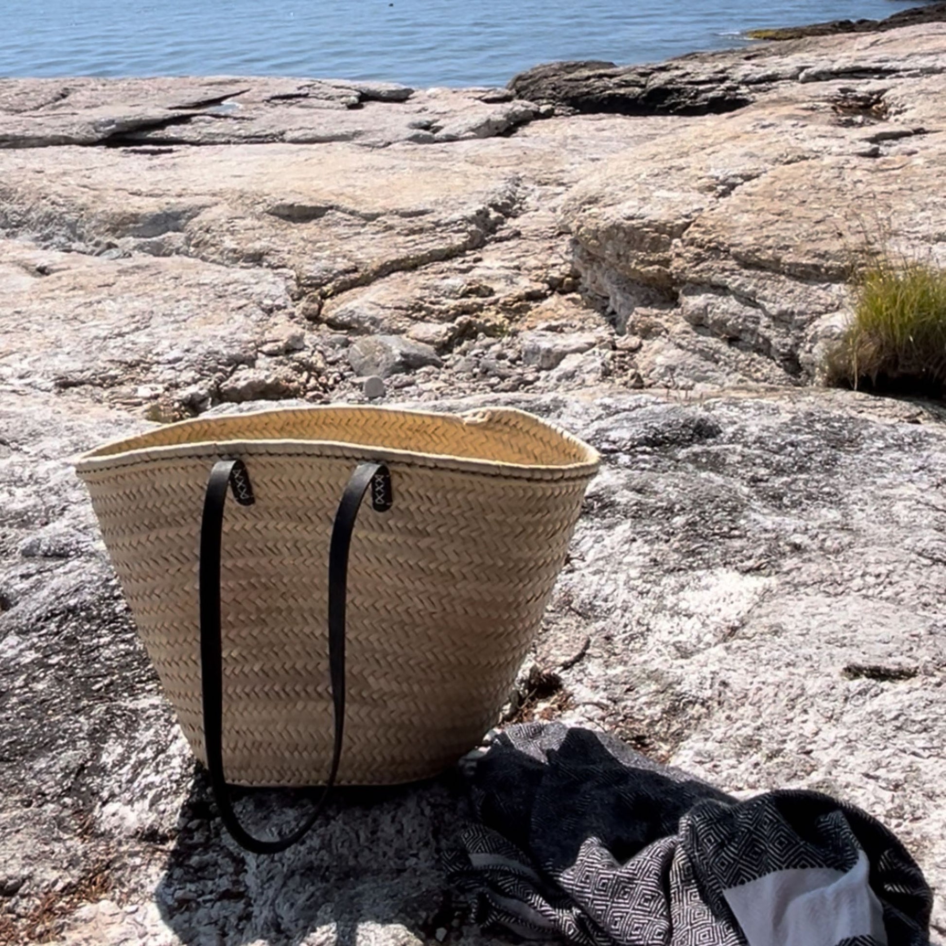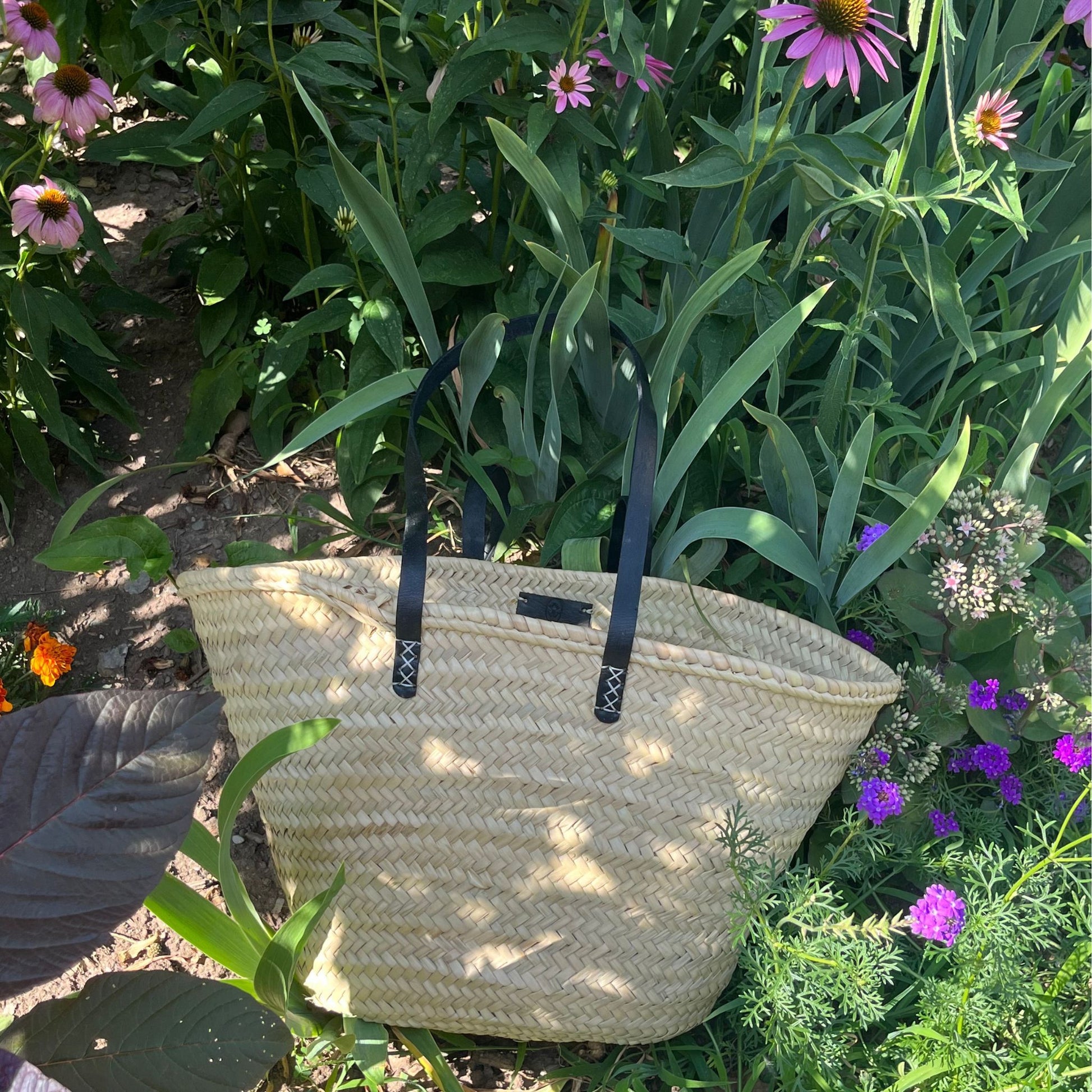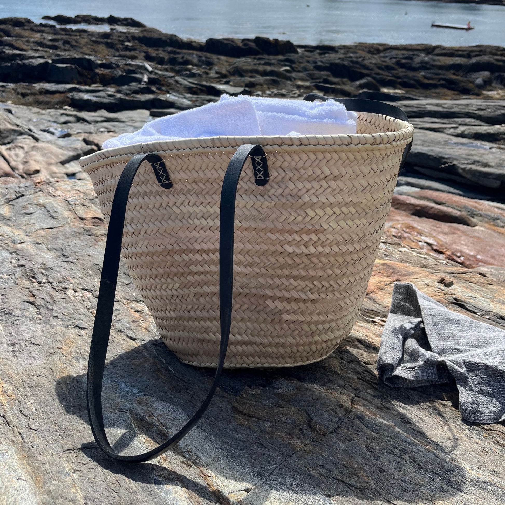 The Dahlia Tote Basket is a modern take on the French market tote featuring black leather shoulder straps. Use it as a beach bag, a pool tote, or a spacious picnic basket. When you're home, it makes for an attractive storage option hanging up or in a corner. Keep your basket in your car or display it on a hook near your front door so you're never without this useful tote basket.