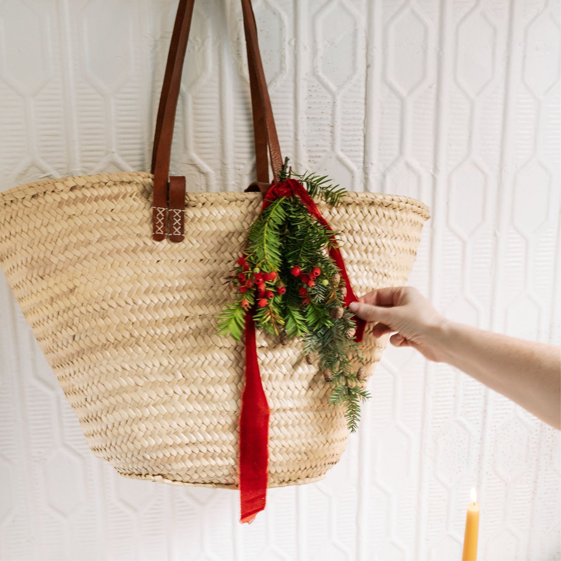 The basket is super lightweight with a sturdy flexible weave made of date palm leaves with a flat bottom to keep the basket upright when you set it down. The leather handles are strong and secure to withstand moderately heavy loads. Crafted in Morocco.