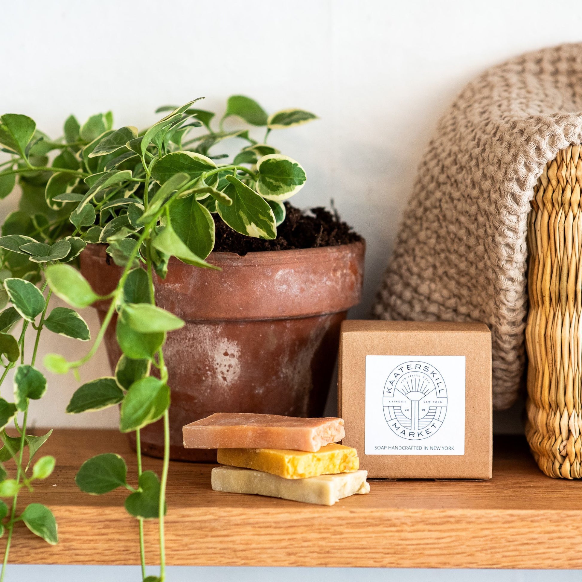 This boxed set of 6 soaps is a hospitable touch for houseguests, your Airbnb, rental property, or daily hand and body washing in your home. Box includes 2 bars of each scent: CALM, FOREST, LAVENDER-ORANGE. Soap is handmade in New York for Kaaterskill Market.