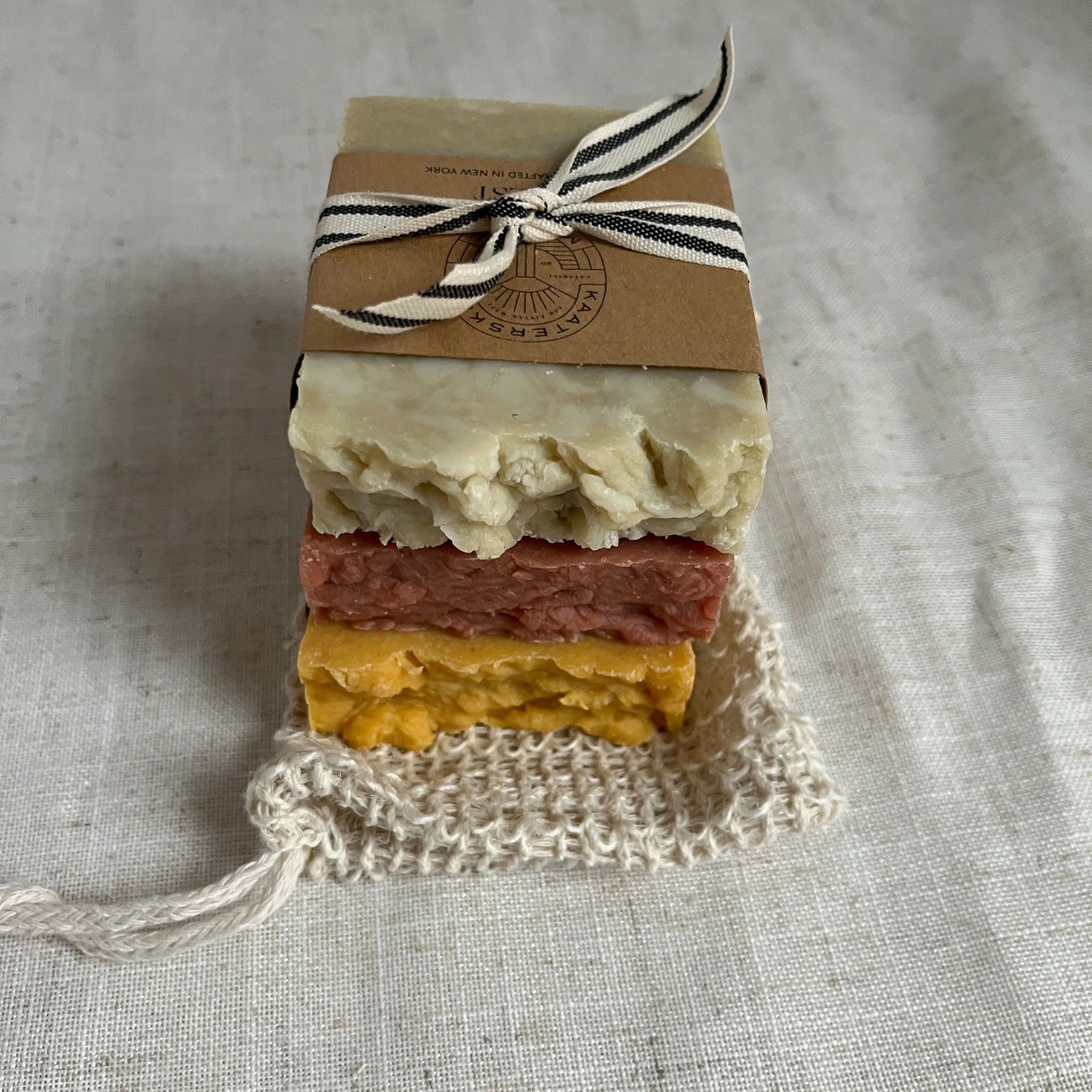 Stock up on soap with three luxurious full-size bars and a sisal exfoliating soap bag and save. Moisturizing soap handmade in upstate New York for Kaaterskill Market. Scented with essential oils and colored with clay.