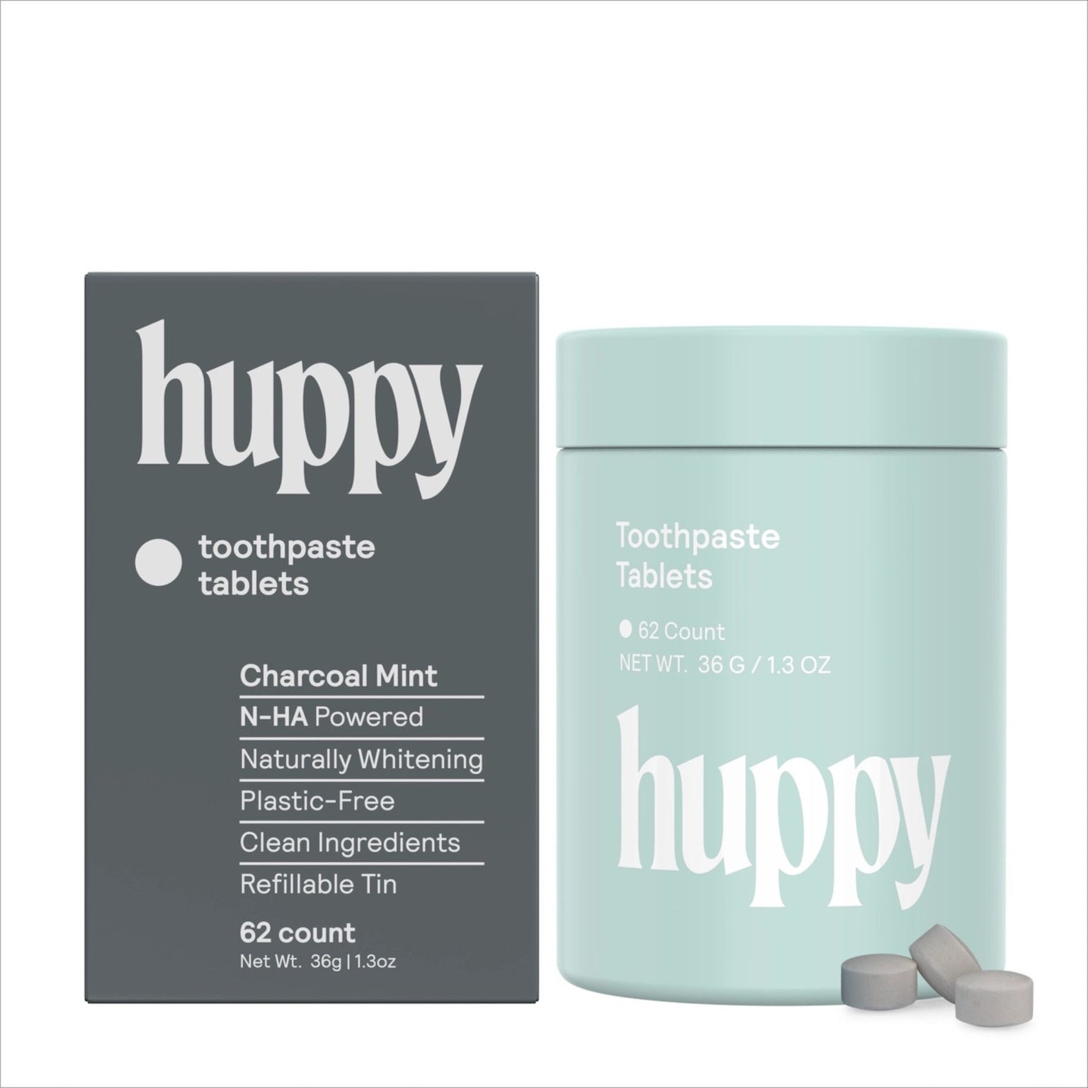 Huppy Toothpaste Tablets in Charcoal Mint are a fluoride-free, plastic-free alternative to traditional toothpaste - ideal for daily brushing at home or on the go. These tablets help whiten teeth, freshen breath, and fight plaque without the mess or waste of a tube.