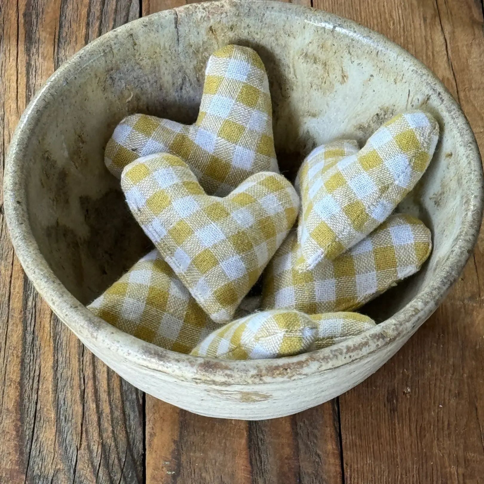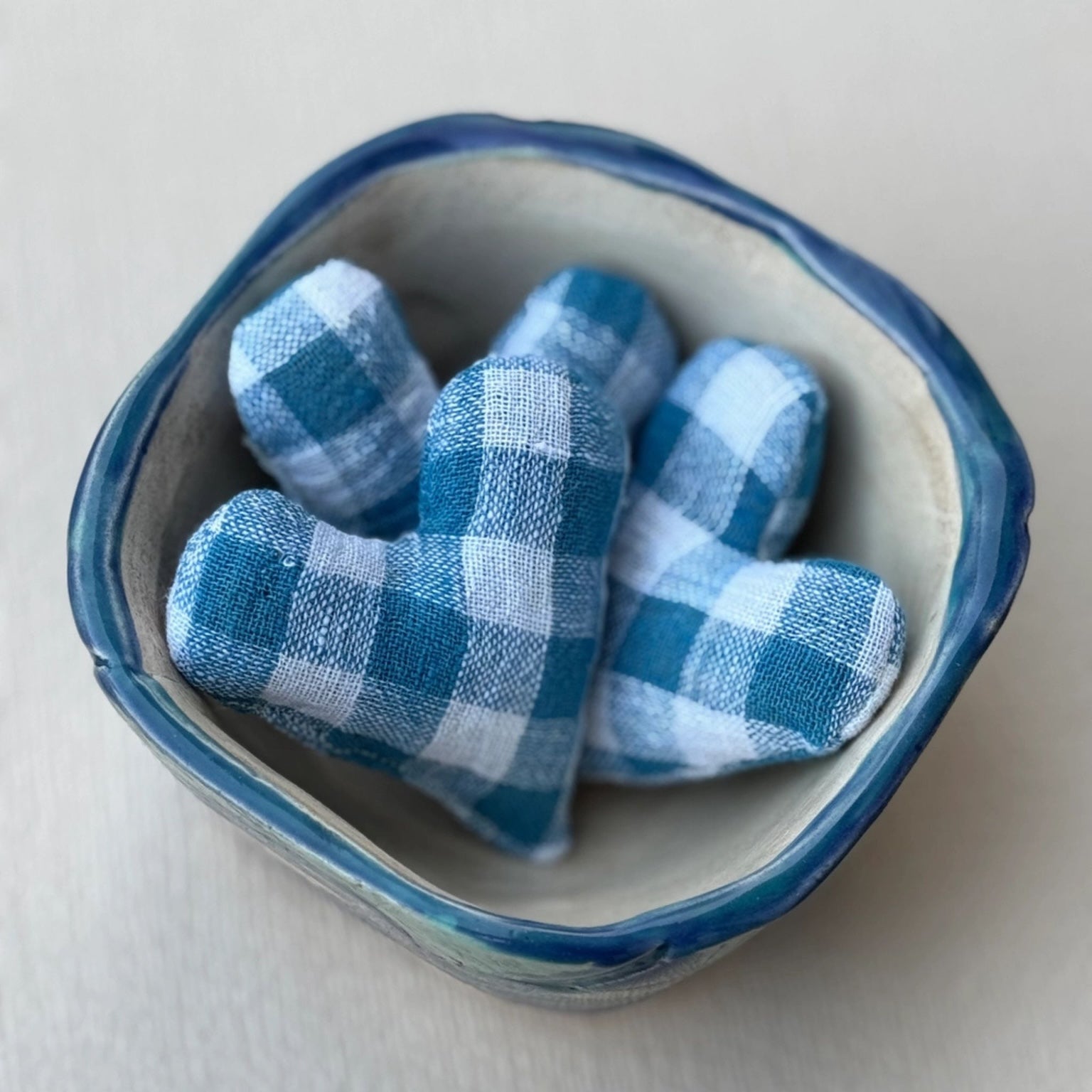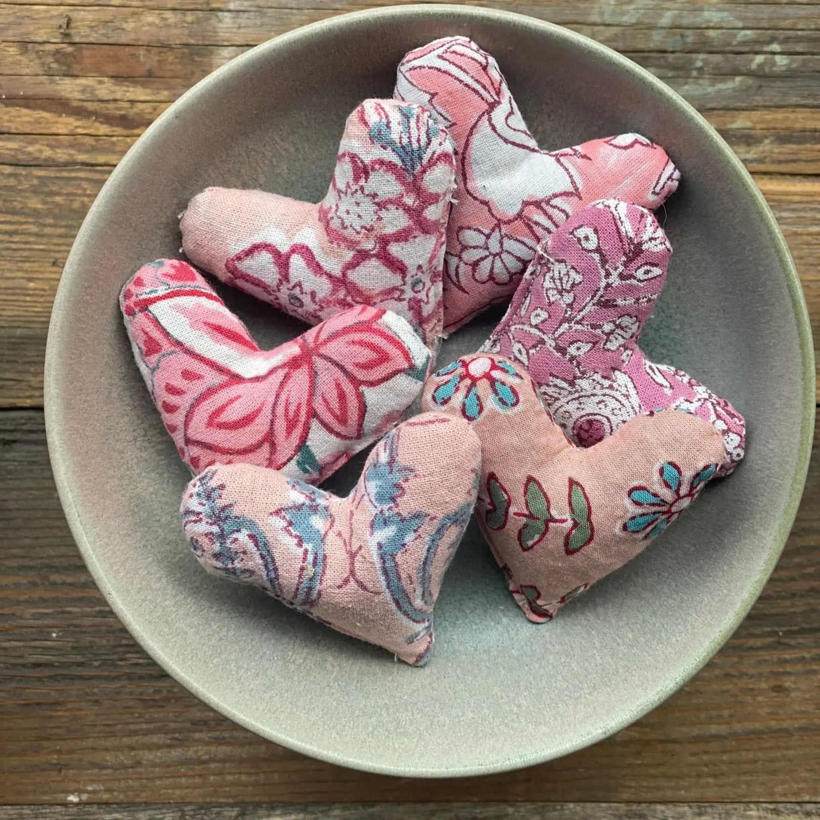 The quilts are made from linen or cotton and the hearts are stuffed with 100% French Lavender.