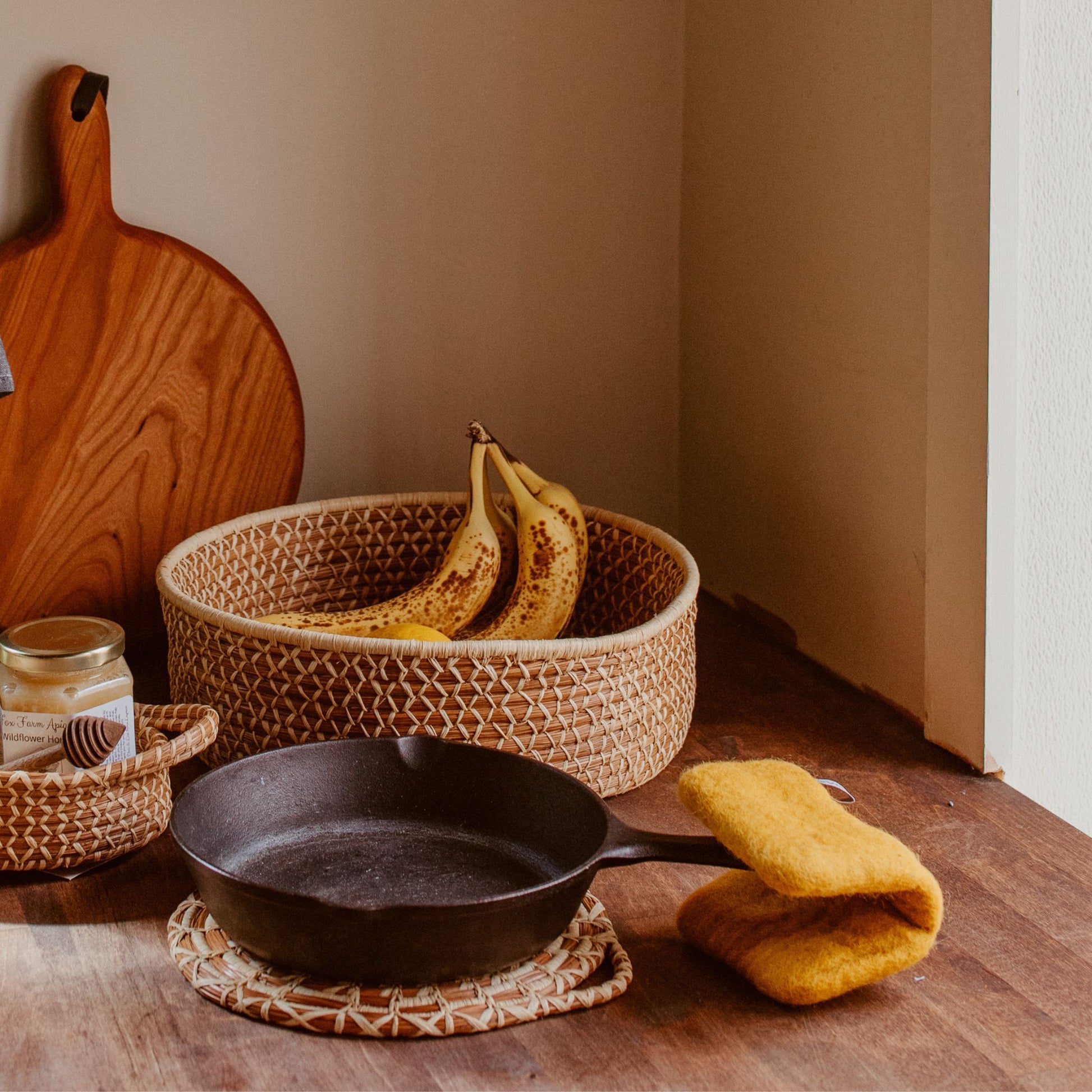 These sweet little pot holders are made of 100% wool. Use them to remove hot pans from the stove or oven or lay them flat as a trivet on your countertop or table. They have pockets on both sides for your thumb and fingers, so easy to grab quickly and slide your hand into. No struggling to get your hand into a big mitt. They take up very little space, neatly stored on your oven handle.